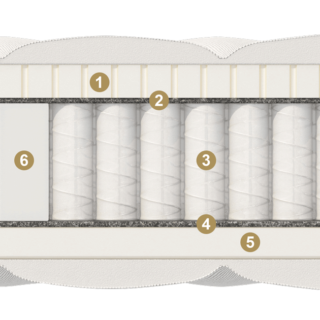 Срок службы свыше 20 лет. Слой плотного термофиксированного фетра из шерсти, хлопка и пуха защищает мягкие материалы от давления пружин. Файбертекс в чехлах пружин эффективно гасит вибрации и сохраняет структуру блока даже при высоких нагрузках.