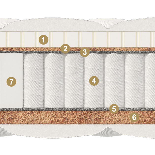 Слой латекса дарит мягкость и эластичность, а кокосовая койра — необходимую жёсткость и прочность. Такое сочетание делает матрас универсальным и физиологически комфортным.